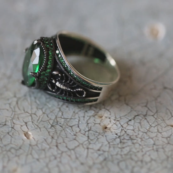 Elevate his collection with this magnificent Silver Emerald Stone Scorpion Ring. This piece is a captivating blend of commanding iconography, the deep green luxury of a gemstone, and the enduring quality of solid 925 Silver.
