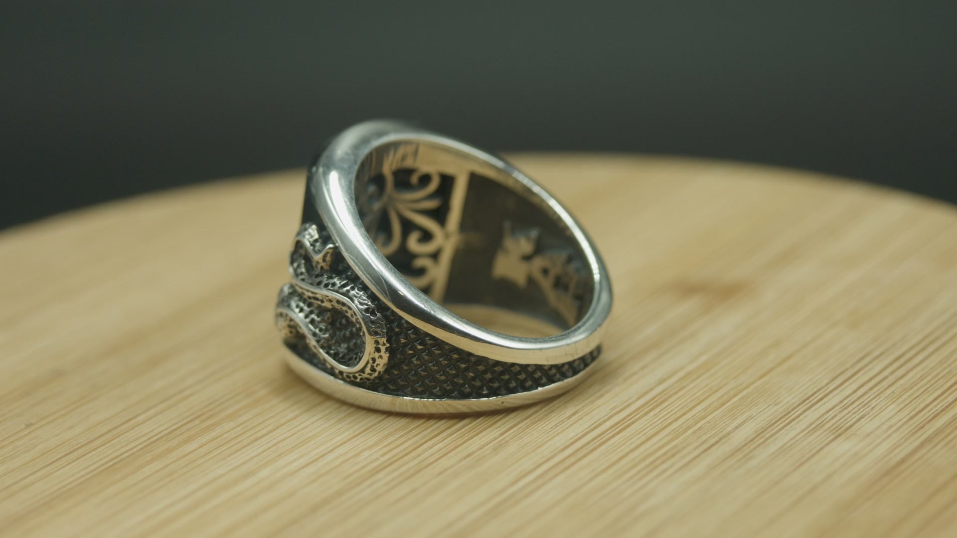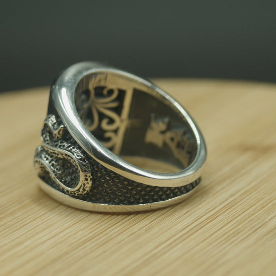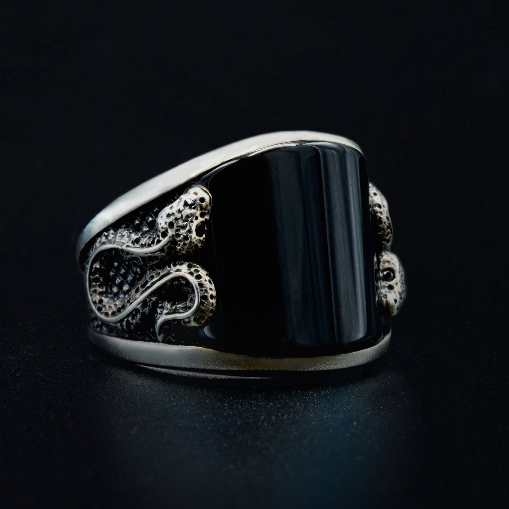 The unique Snake Serpent motif, deeply carved into the metal, wraps around the design. The serpent is a timeless symbol of regeneration and wisdom, giving the ring a Gothic edge and a rich, Vintage Style appeal favored by Biker and alternative jewelry collectors.