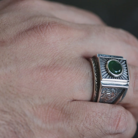 Sterling Silver Men Emerald Ring, Engraved Men Signet Ring, Green Gemstone Men Ring, Square Signet Ring, Wedding Ring, Promise Ring