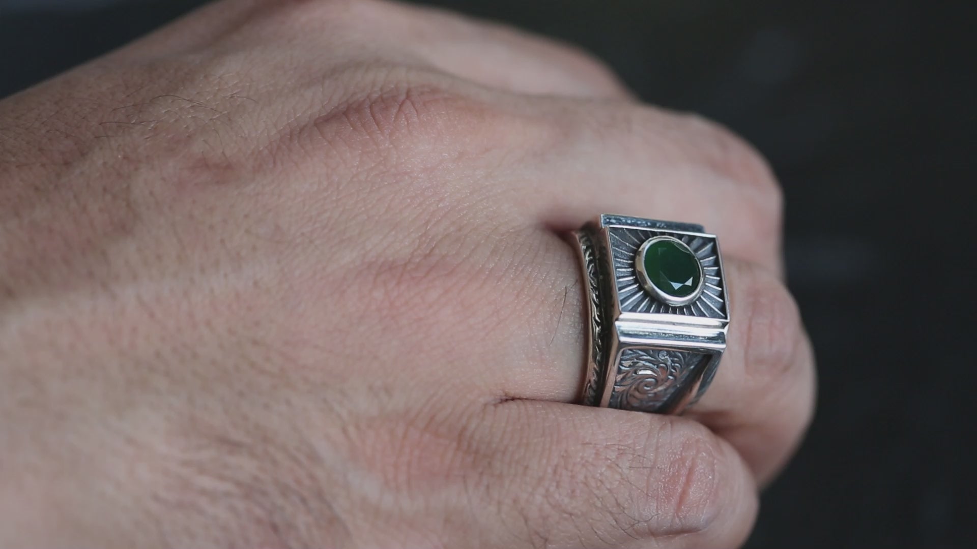 925 Sterling Silver Engraved Emerald Gemstone Ring