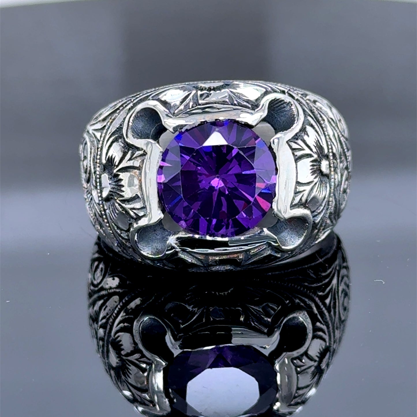 Men Engraved Amethyst Ring, Handmade Natural Silver Amethyst Stone Men Ring