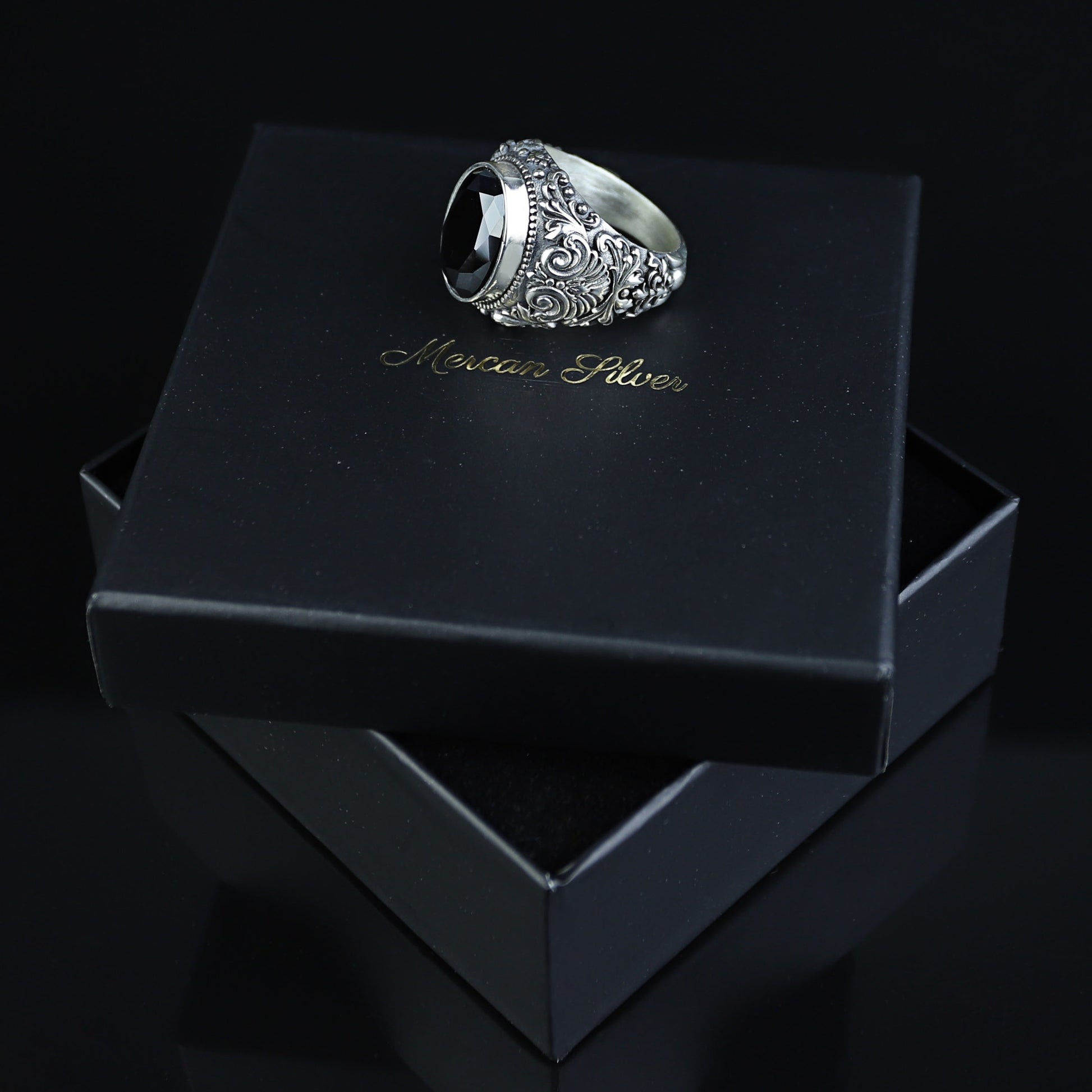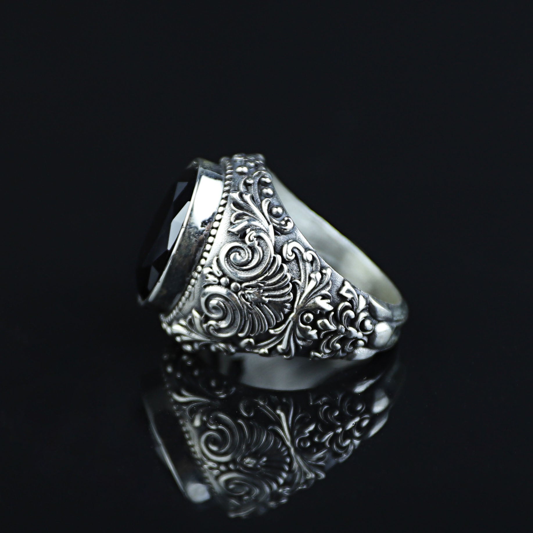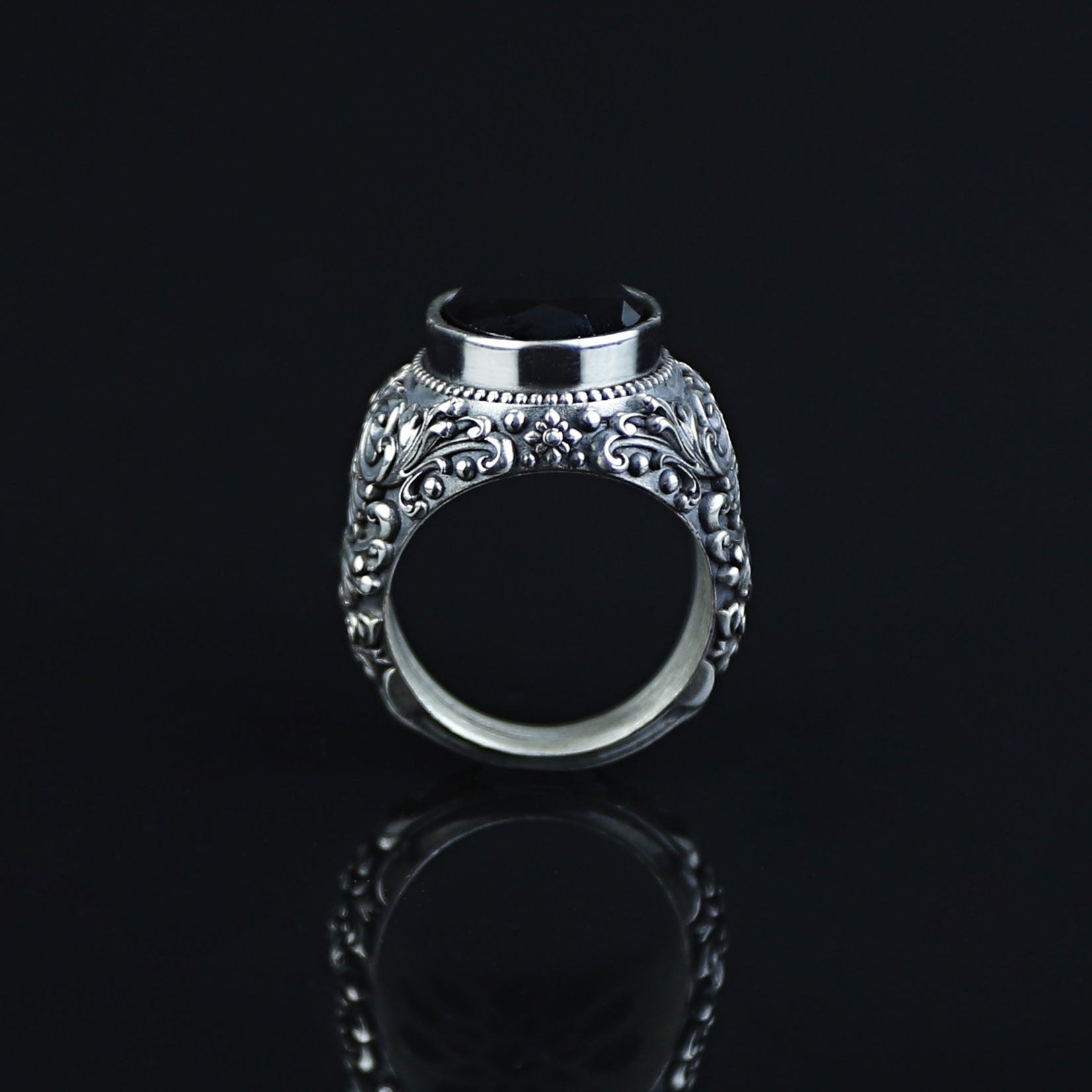 The band features detailed Engraved silverwork, enhancing the ring's unique character and lending a rich, Vintage Ring aesthetic that collectors seek. The dark silver finish (often achieved by oxidizing the recessed areas) highlights the deep carving and intricate details.