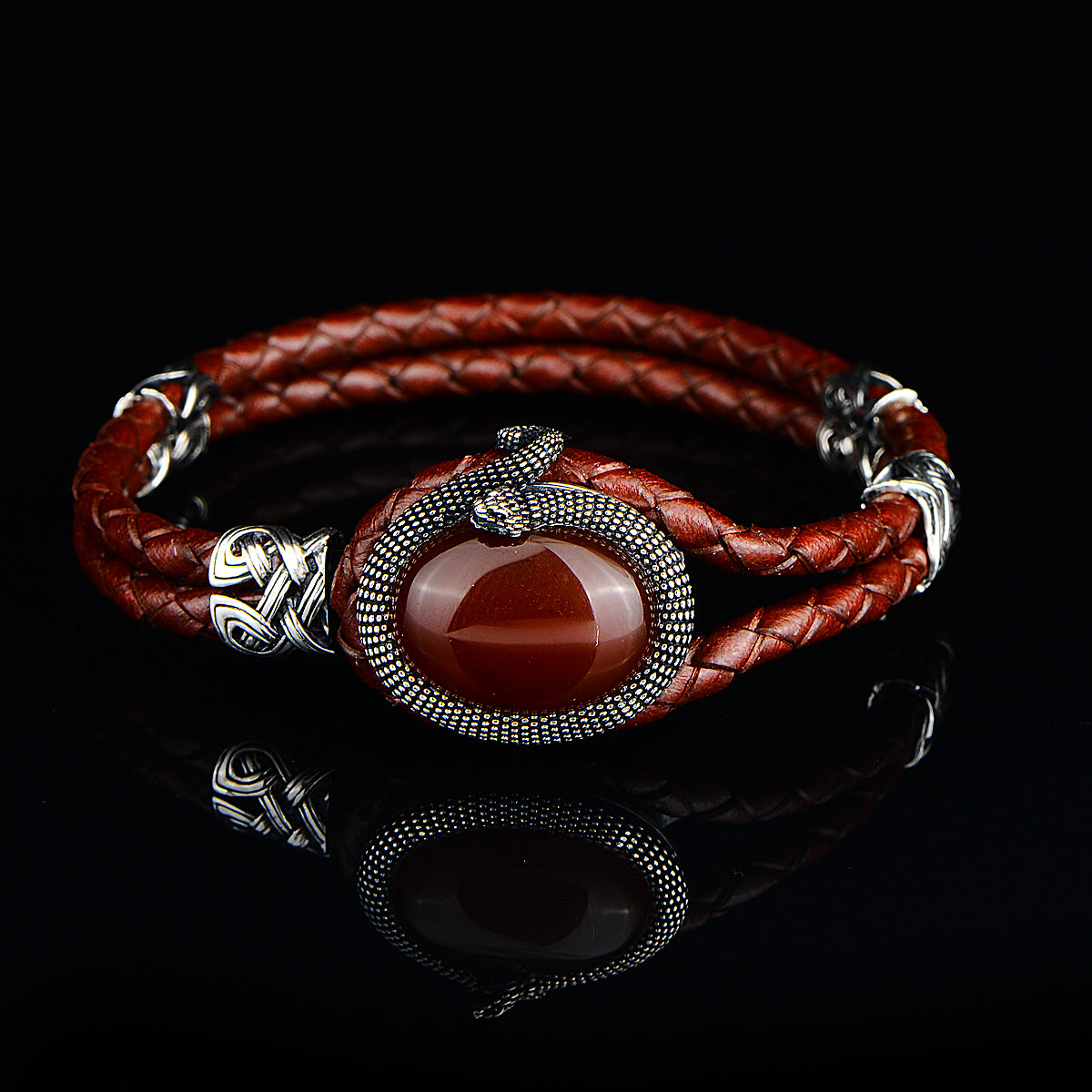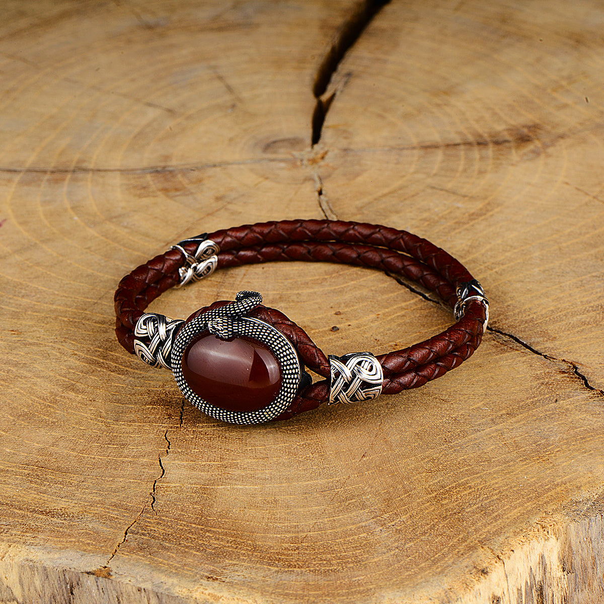 Silbernes Schlangenarmband, silbernes Jemen-Achat-Steinarmband, rotes Lederarmband, silbernes Tierarmband, 925k Sterling Silberarmband