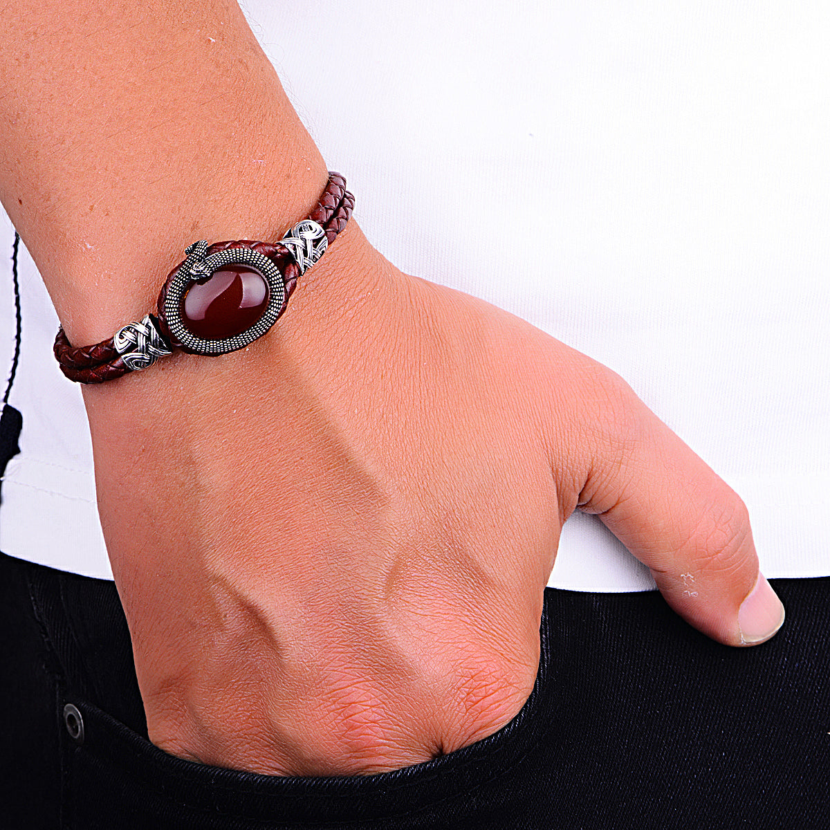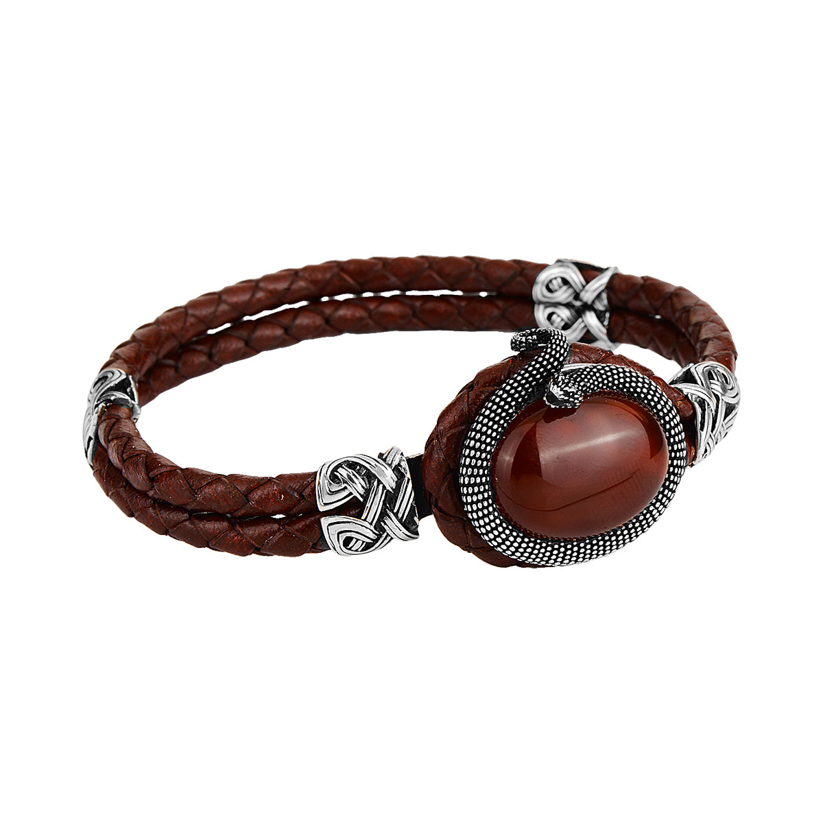 Herren-Lederarmband aus silbernem Schlangenmodell mit Achatstein