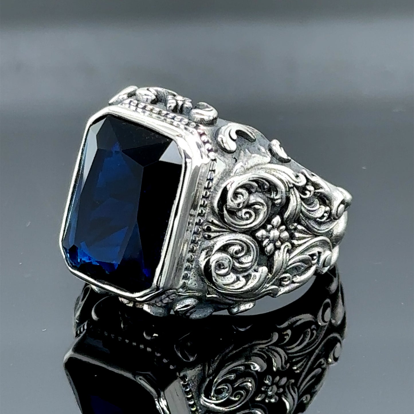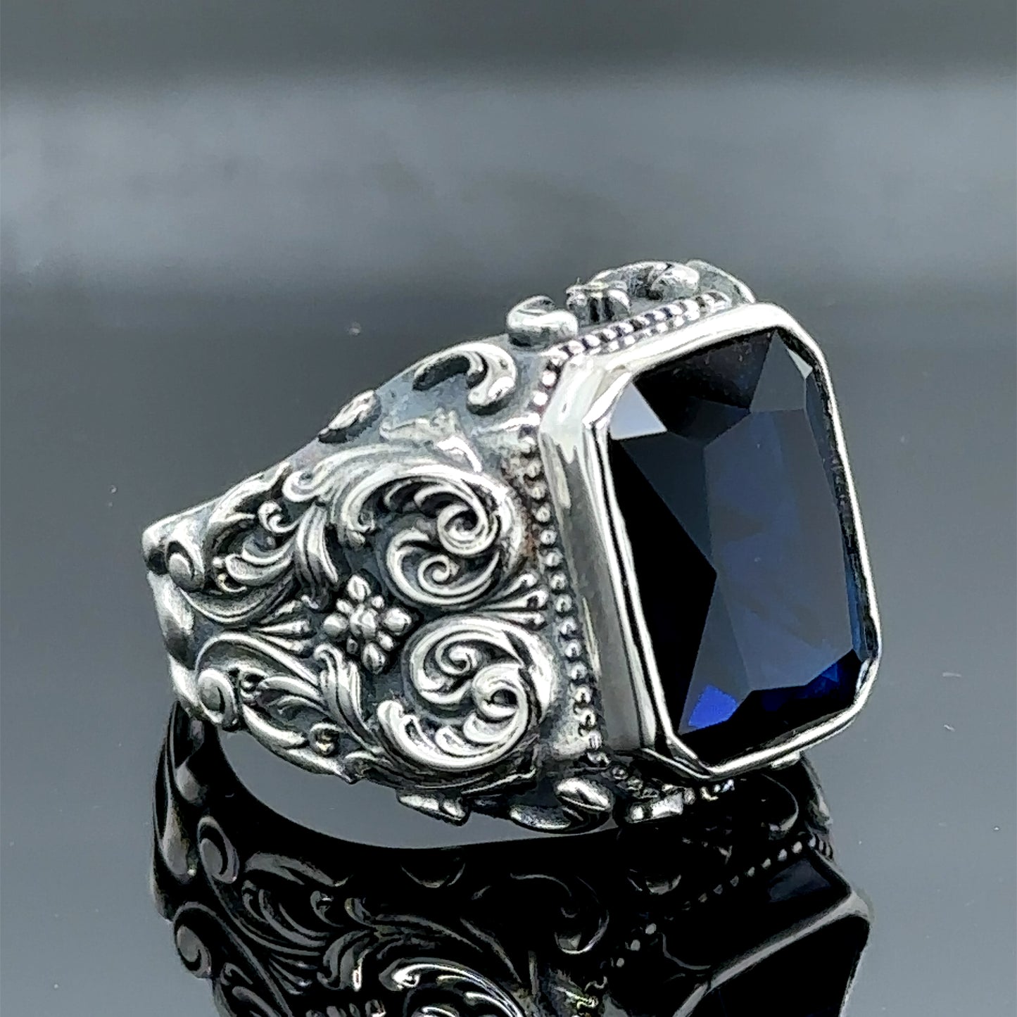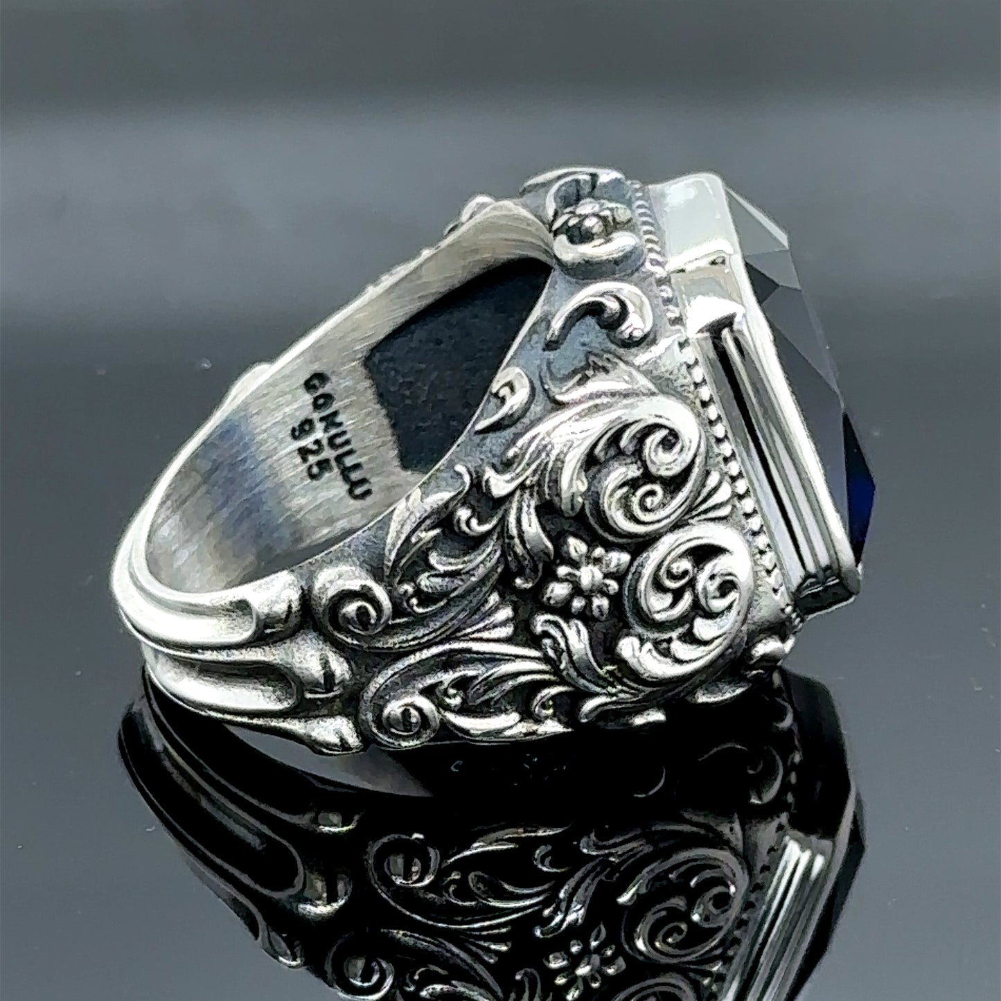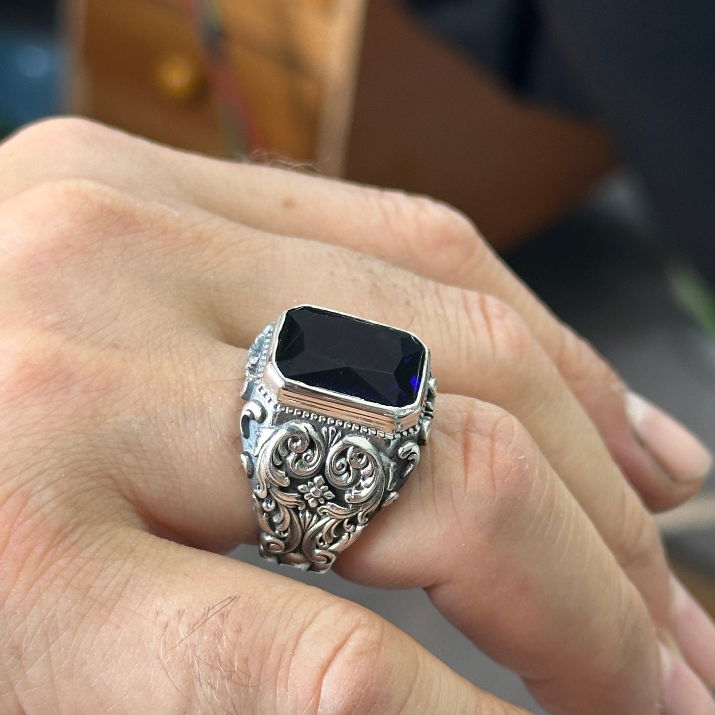 Elevate your style with this exquisite silver sapphire stone ring, handcrafted with intricate Ottoman-inspired engravings. Featuring a striking blue sapphire gemstone, this 925k silver ring exudes timeless elegance. Meticulously crafted by skilled artisans, each ring is a unique work of art that will add a touch of sophistication to any outfit. With its exceptional craftsmanship and eye-catching design, this ring is a true statement piece that will turn heads wherever you go. Embrace the rich cultural heritage and indulge in the luxury of this stunning sapphire ring.