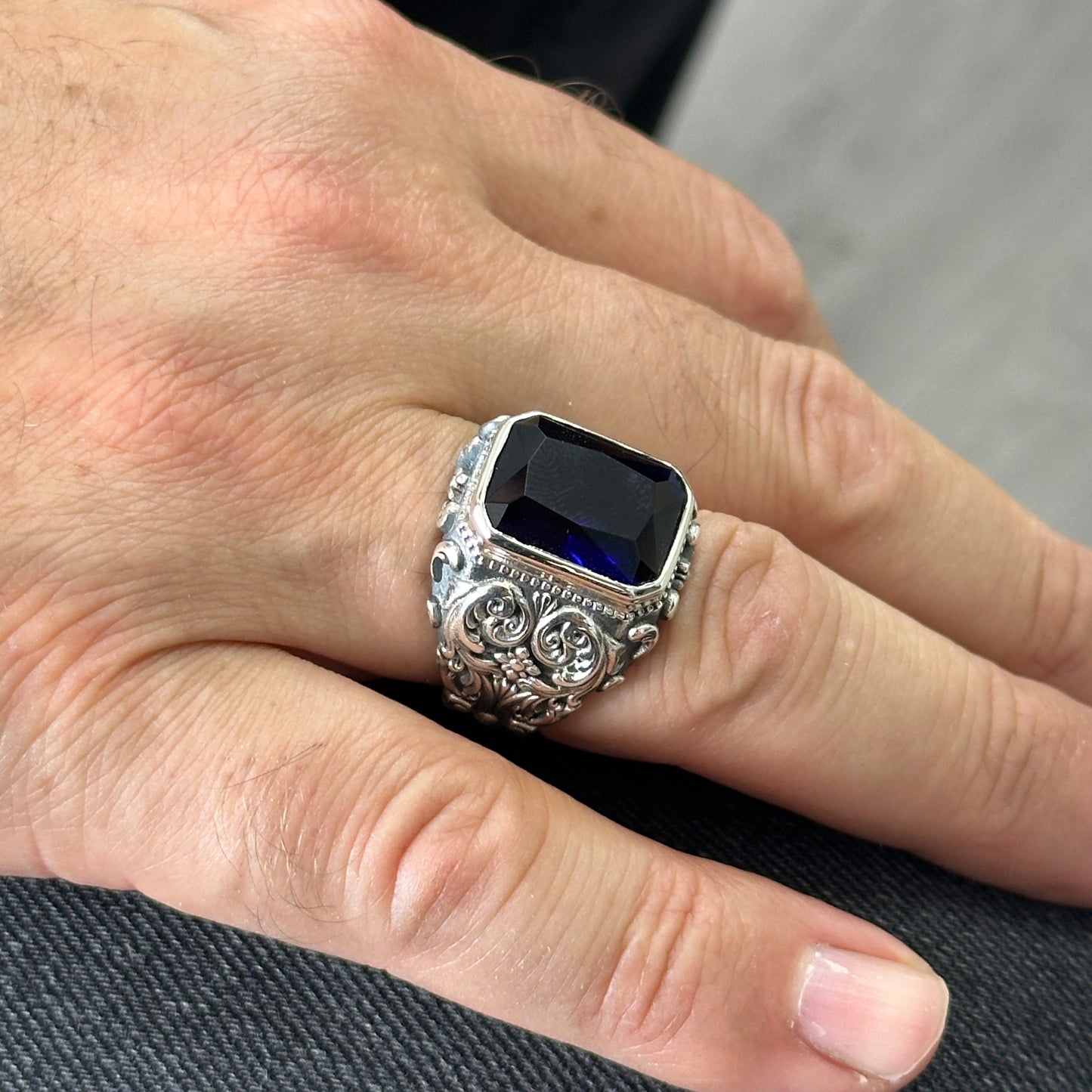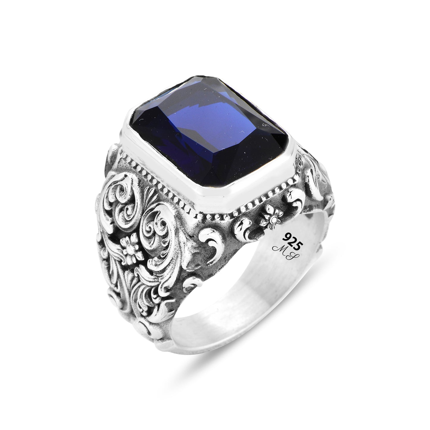 Silver Men Engraved Handmade Sapphire Stone Ring