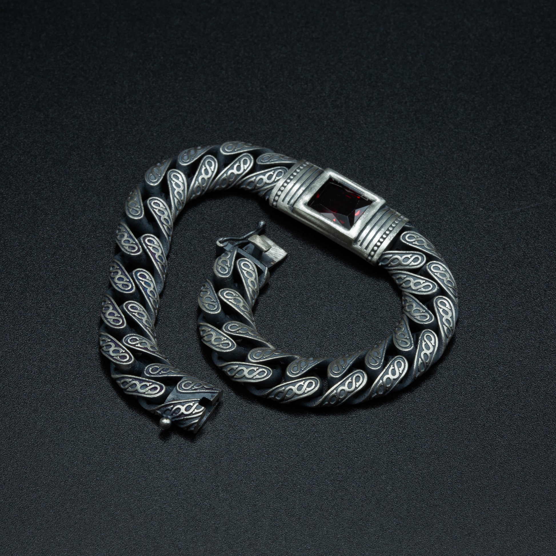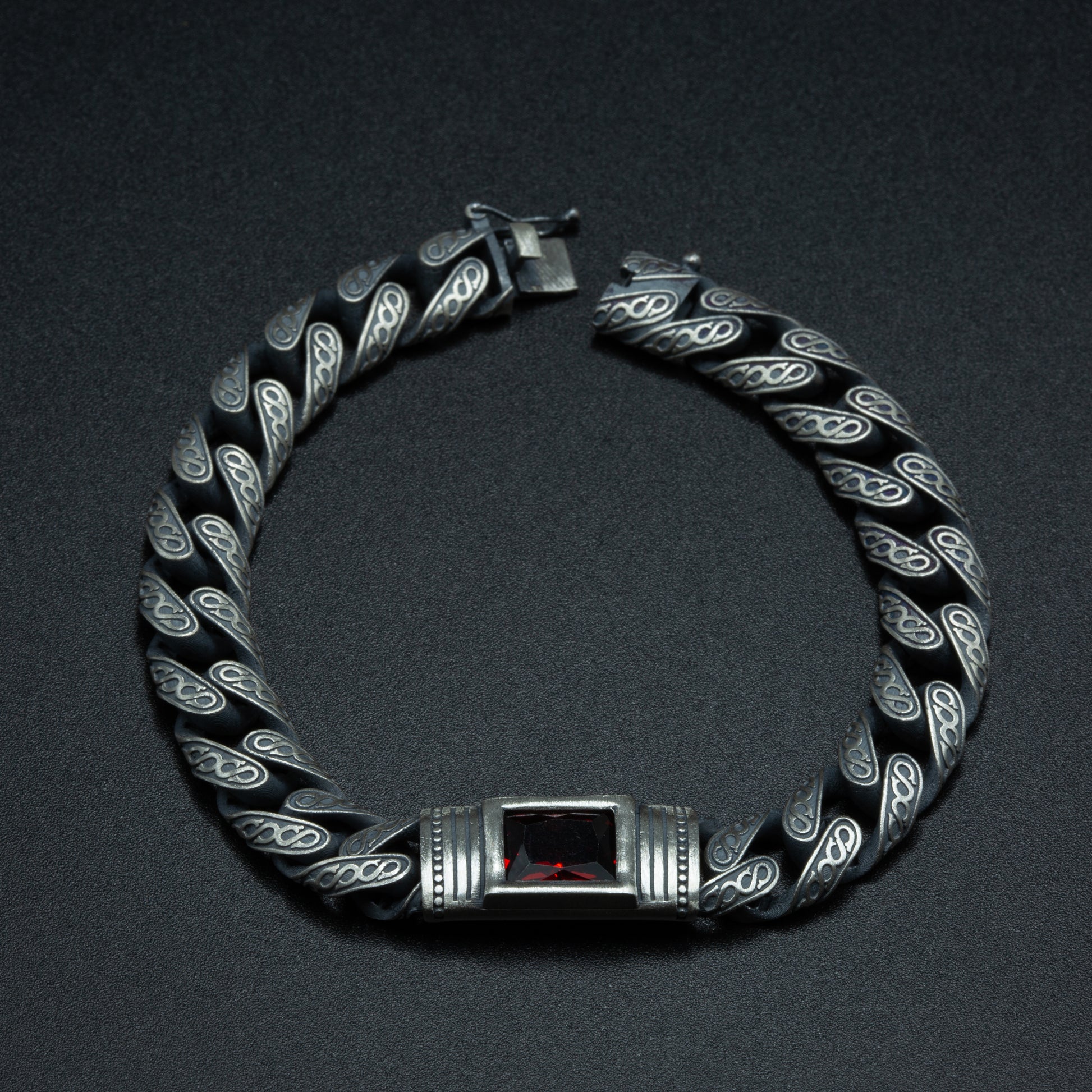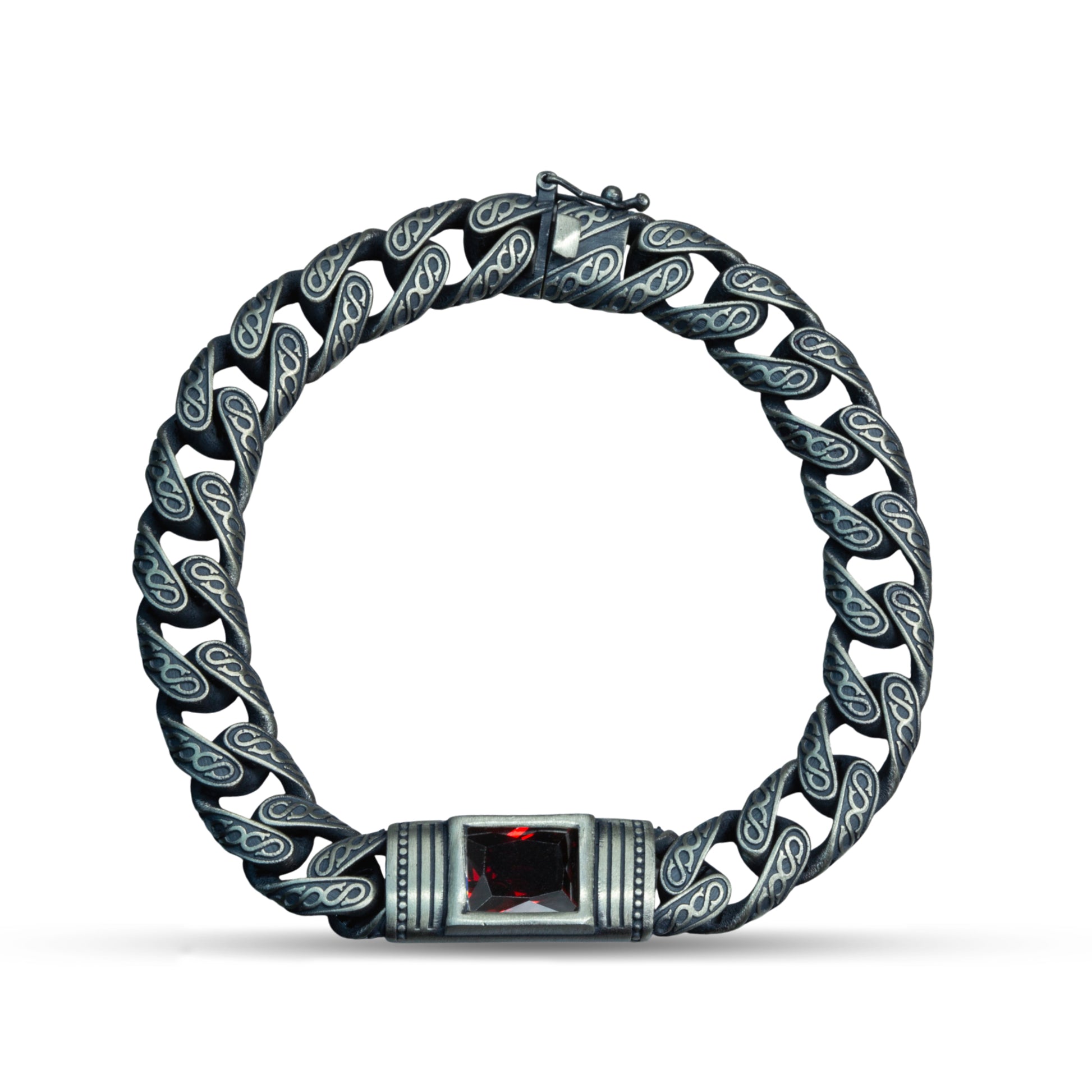 Men Handmade Engraved Red Ruby Gemstone Curb Chain Bracelet