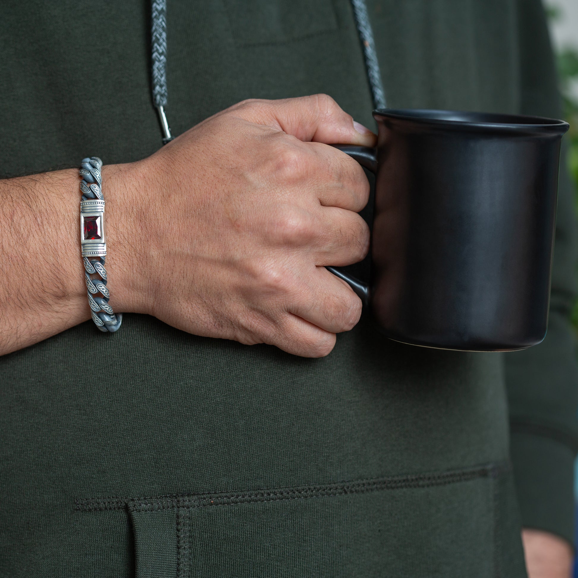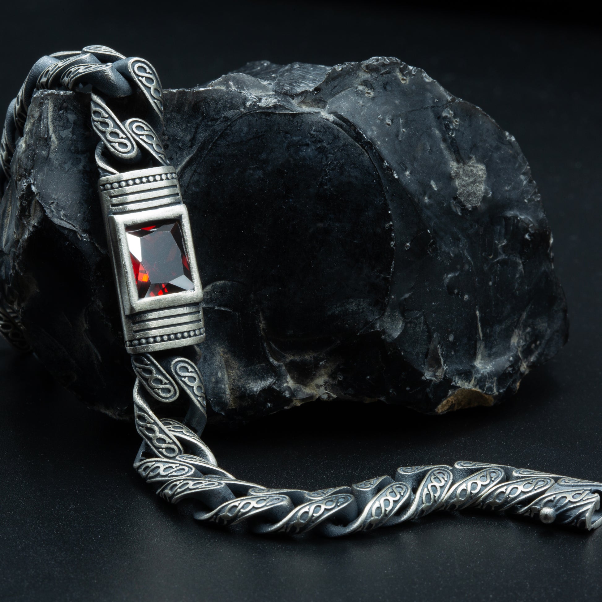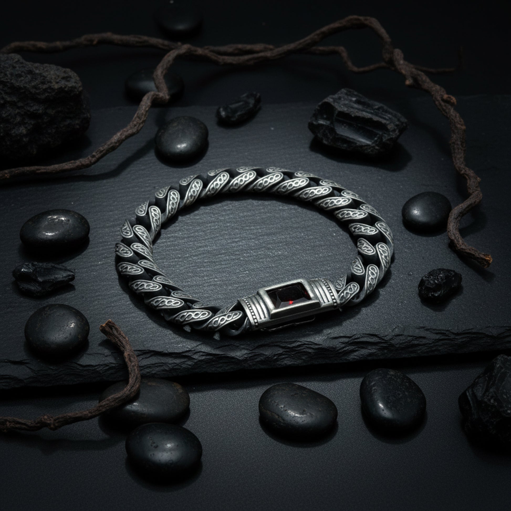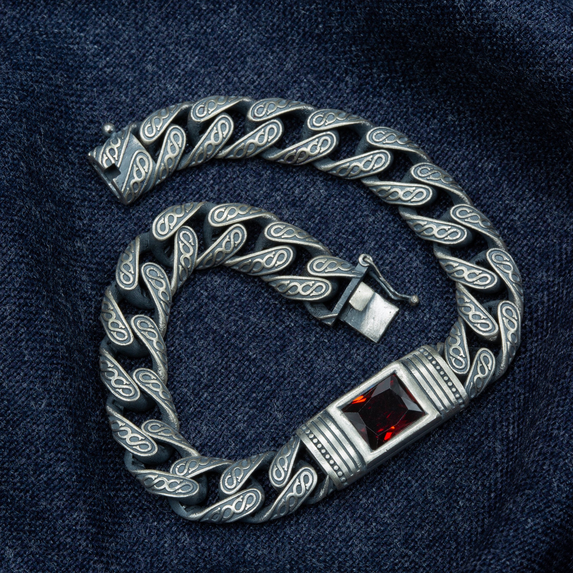 Men Handmade Engraved Red Ruby Gemstone Curb Chain Bracelet