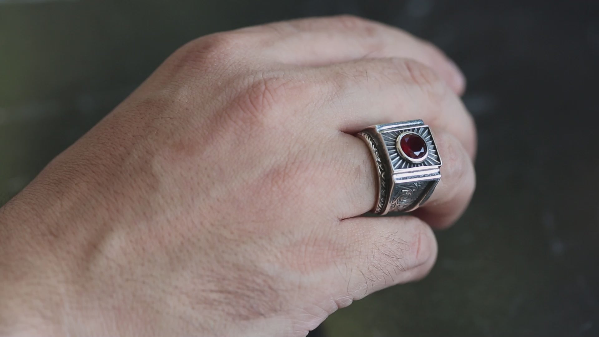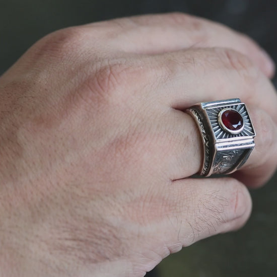 Elevate your style with this magnificent Men Engraved Ruby Stone Ring, seamlessly blending traditional Turkish craftsmanship with modern sophistication. Hand-finished with meticulous attention to detail, this ring is more than just an accessory—it's a powerful statement inspired by heritage.